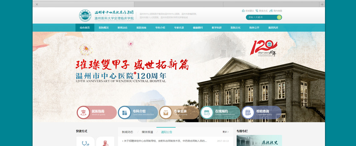 溫州市中心醫(yī)院(溫州市腫瘤醫(yī)院、溫州市醫(yī)藥科學(xué)研究所)坐落在美麗的甌江之濱,是一所集醫(yī)療、教學(xué)、科研、預(yù)防、保健、康復(fù)為一體的三級甲等綜合醫(yī)院,是浙江三家百年名院之一。醫(yī)院始建于1897年(清光緒23年),前身是定理醫(yī)院、白累德醫(yī)院、溫州市第二人民醫(yī)院。2002年—2003年,醫(yī)院先后和溫州市醫(yī)藥科學(xué)研究所、溫州市第五人民醫(yī)院、溫州市腫瘤醫(yī)院資產(chǎn)重組合并,成為三院一所格局的醫(yī)療集團(tuán);2008年成為溫州醫(yī)科大學(xué)附屬醫(yī)院——定理臨床學(xué)院;2012年晉級三級甲等綜合醫(yī)院,更名為溫州市中心醫(yī)院;2015年成立溫州