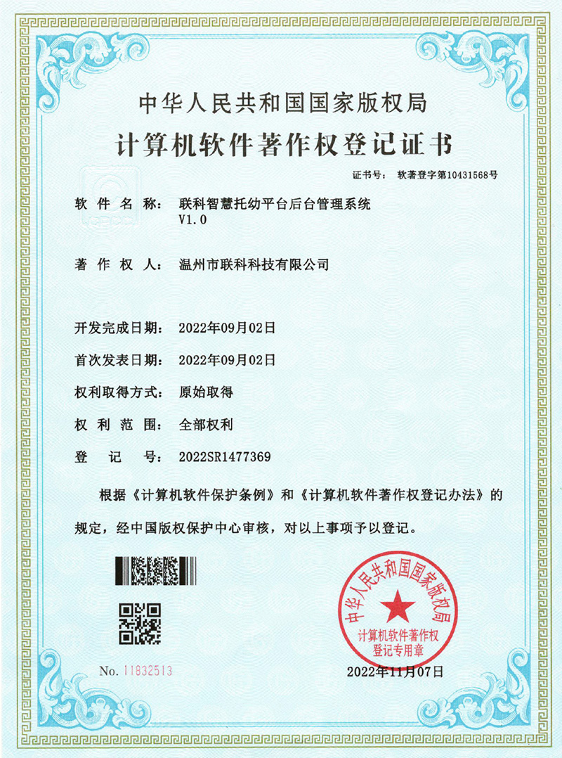 《聯(lián)科智慧托幼平臺(tái)后臺(tái)管理系統(tǒng)V1.0》于2022年11月07日被正式授予《中華人民共和國國家版權(quán)局計(jì)算機(jī)軟件著作權(quán)登記證書》,登記號(hào)為2020SR1477369。