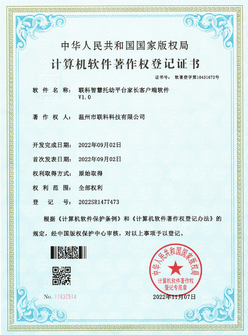 《聯(lián)科智慧托幼平臺(tái)家長客戶端軟件V1.0》于2022年11月07日被正式授予《中華人民共和國國家版權(quán)局計(jì)算機(jī)軟件著作權(quán)登記證書》,登記號(hào)為2020SR1477473。