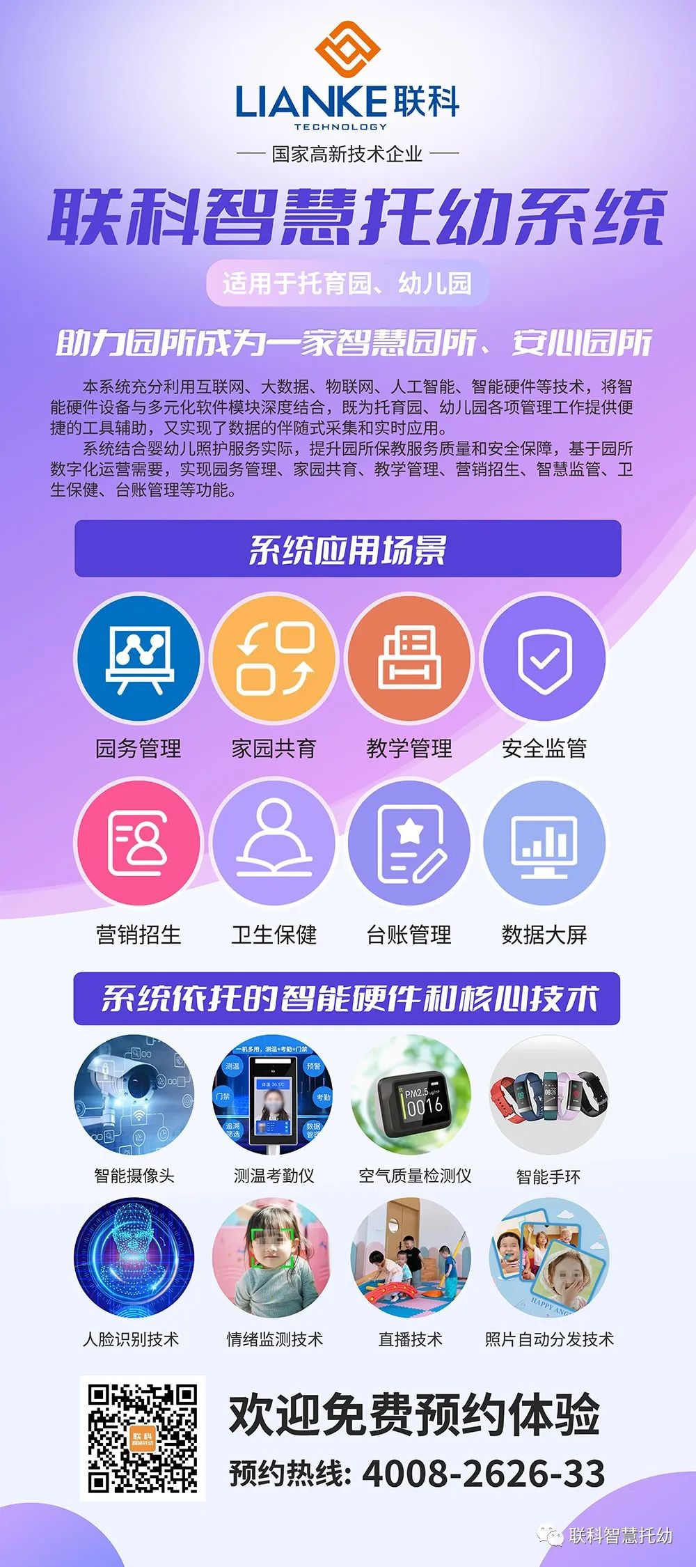 《聯(lián)科智慧托幼系統(tǒng)》充分利用互聯(lián)網(wǎng)、大數(shù)據(jù)、物聯(lián)網(wǎng)、人工智能、智能硬件等技術(shù),將智能硬件設(shè)備與多元化軟件模塊深度結(jié)合,既為托育園、幼兒園各項(xiàng)管理工作提供便捷的工具輔助,又實(shí)現(xiàn)了數(shù)據(jù)的伴隨式采集和實(shí)時(shí)應(yīng)用。系統(tǒng)結(jié)合嬰幼兒照護(hù)服務(wù)實(shí)際,提升園所保教服務(wù)質(zhì)量和安全保障,基于園所數(shù)字化運(yùn)營需要,實(shí)現(xiàn)園務(wù)管理、家園共育、教學(xué)管理、營銷招生、智慧監(jiān)管、衛(wèi)生保健、臺(tái)賬管理等功能。