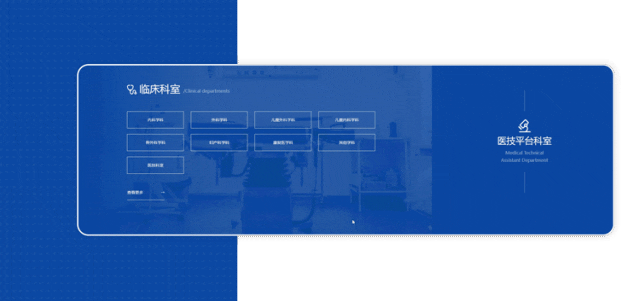 為了讓患者更好地了解醫(yī)院各個科室的特點和優(yōu)勢,我們需要設計科室介紹的板塊。在設計中,我們使用背景圖片來展示科室的特點和設施情況。同時還可以設置互動環(huán)節(jié),其中兩大科室的來回切換,可以讓患者快捷使用和清楚知曉科室的所屬,讓患者更好地了解各個科室的情況。