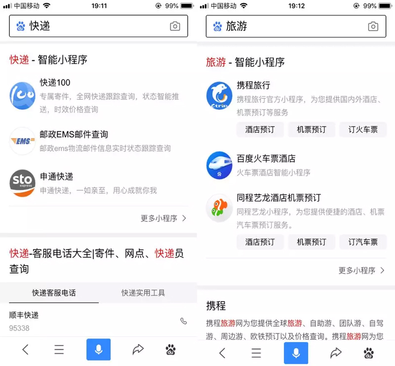 泛詞聚合卡片示例:當(dāng)用戶搜索“快遞”時(shí),搜索結(jié)果中會(huì)匹配出“快遞100、郵政EMS郵件查詢”等3個(gè)相關(guān)智能小程序。點(diǎn)擊下方的“更多小程序”,可以查看與“快遞”或“旅游“相關(guān)的全部智能小程序。
