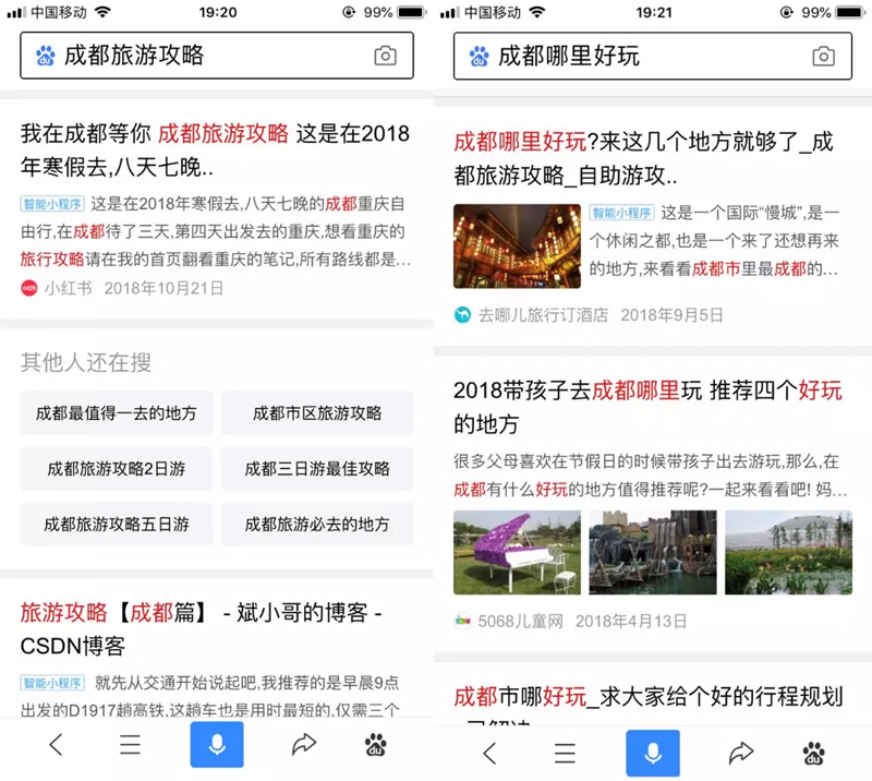 長尾詞搜索示例:用戶搜索“成都旅游攻略”“成都哪里好玩”等關(guān)鍵詞,小紅書和去哪兒旅行的相關(guān)內(nèi)容都會(huì)以智能小程序的方式出現(xiàn),并會(huì)通過醒目的“智能小程序”標(biāo)記提醒用戶。