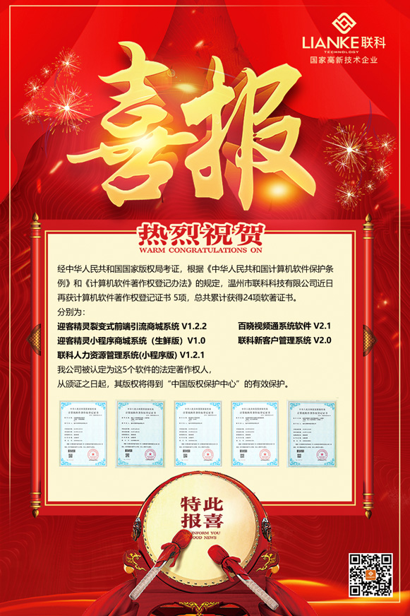 經(jīng)中華人民共和國(guó)國(guó)家版權(quán)局考證,根據(jù)《中華人民共和國(guó)計(jì)算機(jī)軟件保護(hù)條例》和《計(jì)算機(jī)軟件著作權(quán)登記辦法》的規(guī)定,溫州市聯(lián)科科技有限公司近日取得計(jì)算機(jī)軟件著作權(quán)登記證書5項(xiàng)。