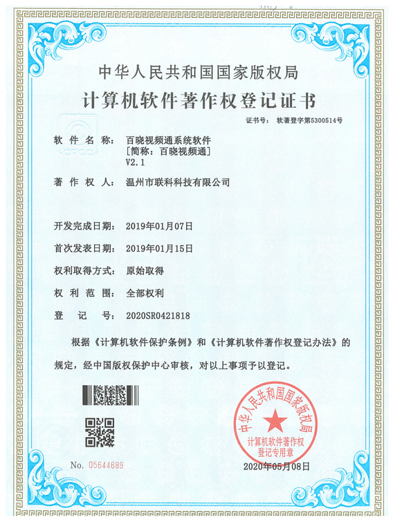 《百曉視頻通系統(tǒng)軟件V2.1》于2020年05月08日被正式授予《中華人民共和國(guó)國(guó)家版權(quán)局計(jì)算機(jī)軟件著作權(quán)登記證書》,登記號(hào)為2020SR0421818。