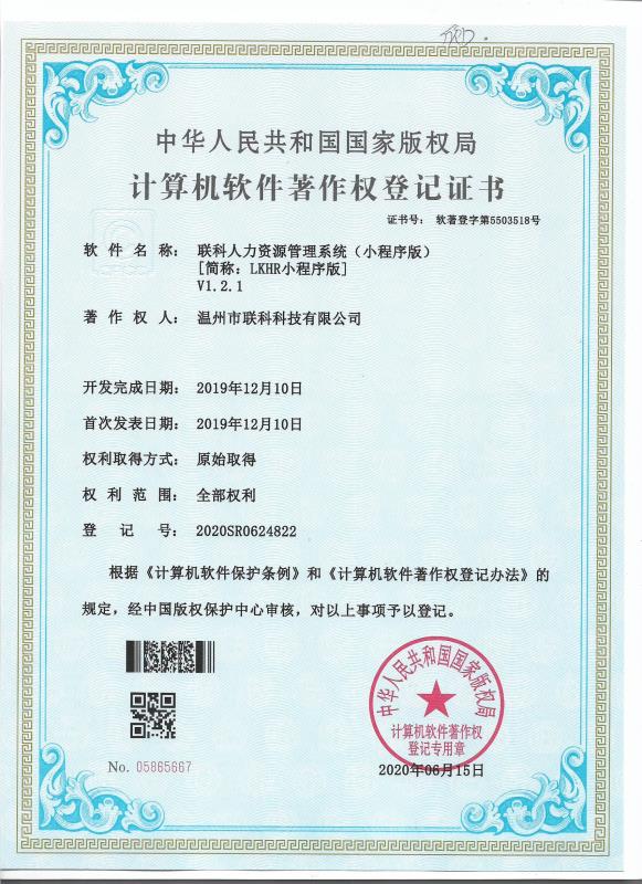 《聯(lián)科人力資源管理系統(tǒng)(小程序版)V1.2.1》于2010年06月15日被正式授予《中華人民共和國(guó)國(guó)家版權(quán)局計(jì)算機(jī)軟件著作權(quán)登記證書》,登記號(hào)為2020SR0624822。