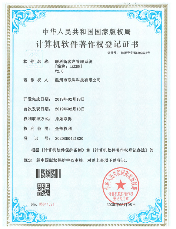 《聯(lián)科新客戶管理系統(tǒng)V2.0》于2020年05月08日被正式授予《中華人民共和國(guó)國(guó)家版權(quán)局計(jì)算機(jī)軟件著作權(quán)登記證書》,登記號(hào)為2020SR0421830。