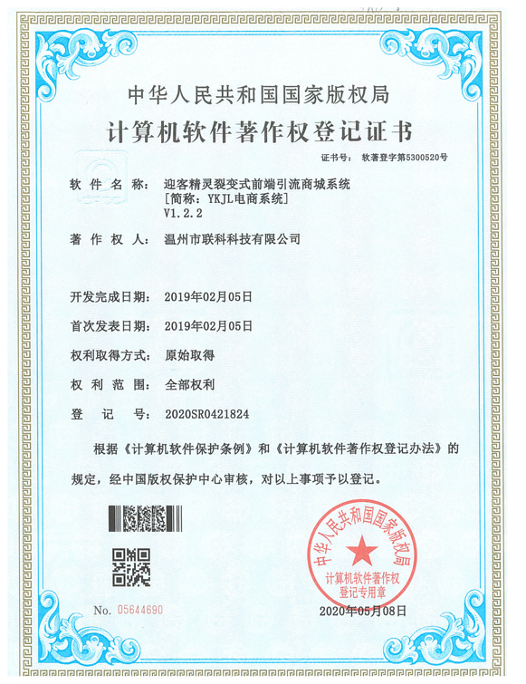 《迎客精靈裂變式前端引流商城系統(tǒng)V1.2.2》于2020年05月08日被正式授予《中華人民共和國(guó)國(guó)家版權(quán)局計(jì)算機(jī)軟件著作權(quán)登記證書》,登記號(hào)為2020SR0421824。