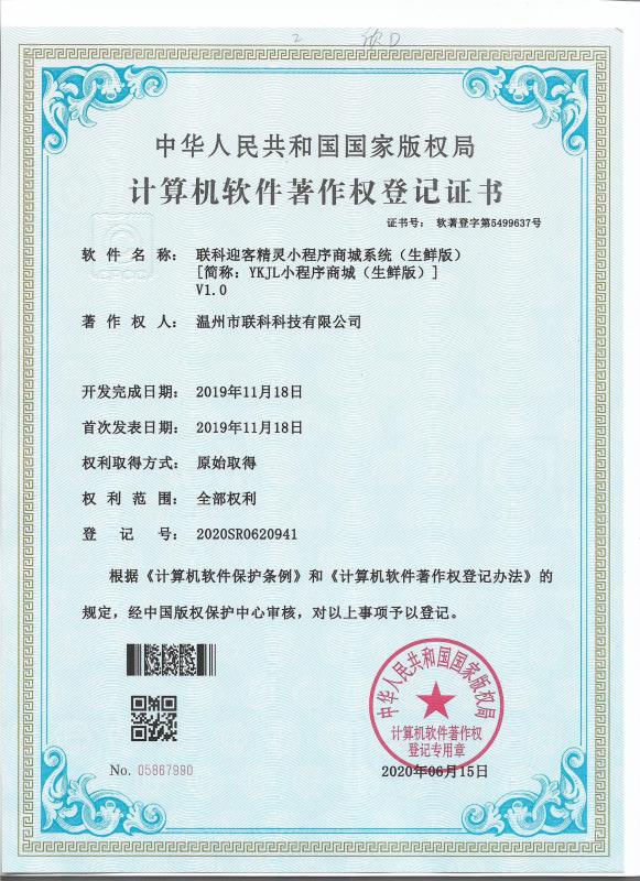 《聯(lián)科迎客精靈小程序商城系統(tǒng)(生鮮版)V1.0》于2020年06月15日被正式授予《中華人民共和國(guó)國(guó)家版權(quán)局計(jì)算機(jī)軟件著作權(quán)登記證書》,登記號(hào)為2020SR0620941。