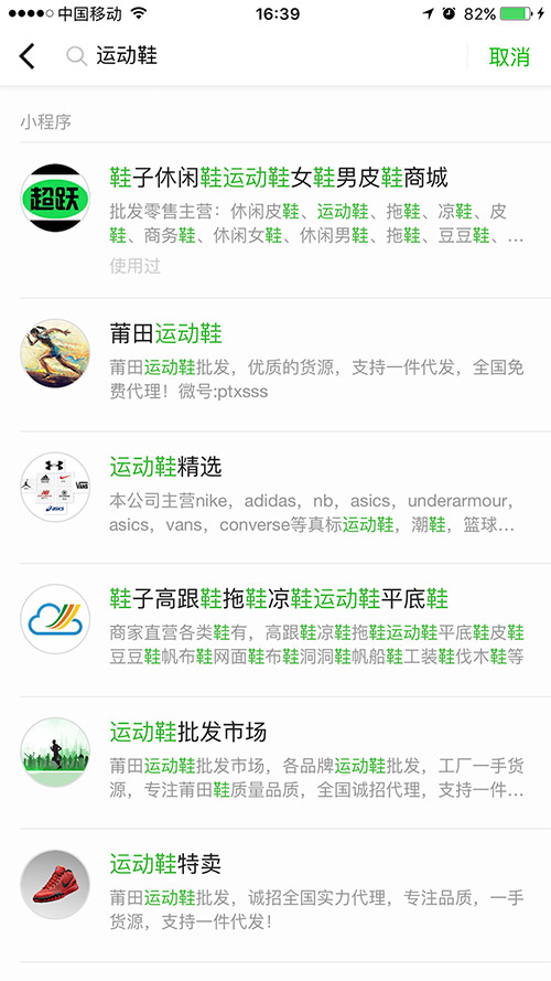 比如上面的圖片中,小程序中搜索關鍵詞“運動鞋”,就出現(xiàn)很多相關的關鍵詞,如男鞋、女鞋、涼鞋、皮鞋、商務鞋等這些用戶使用頻率高的產品關鍵詞,當用戶去搜索男鞋、女鞋這些詞的時候這個小程序依然會有展現(xiàn)的概率。