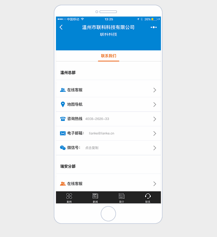 在聯(lián)系我們欄目中點擊“微信號”按鈕,快速復制微信號,完成添加微信好友的功能,達到瀏覽者于企業(yè)平臺之間的直接對接,提高營銷精準度與好感度;