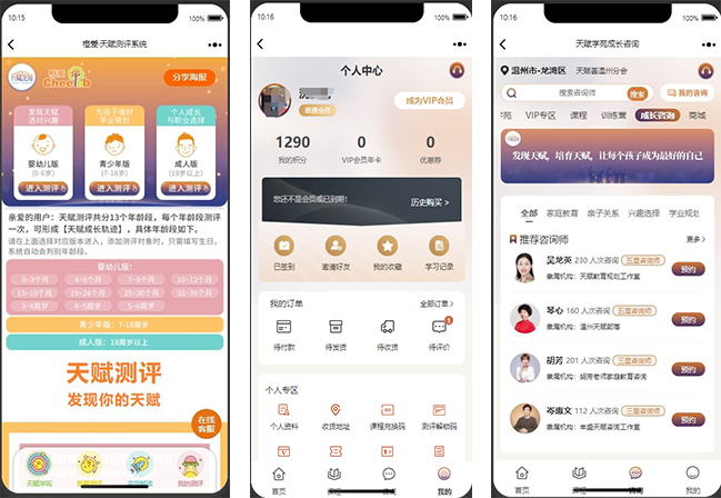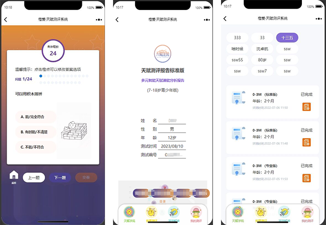 橙愛測評系統(tǒng)用到的八大智能數(shù)據(jù)、測評試卷、測評題目、測評結果數(shù)據(jù)、測評報告數(shù)據(jù)、測評報告訂單、訪問日志、報告解鎖碼和預約用戶等內(nèi)容進行管理。系統(tǒng)支持多用戶多年齡段的測評,根據(jù)用戶端測試結果進行數(shù)據(jù)處理,從而形成測評對象的專業(yè)測評報告,傳輸給前端用戶查閱。