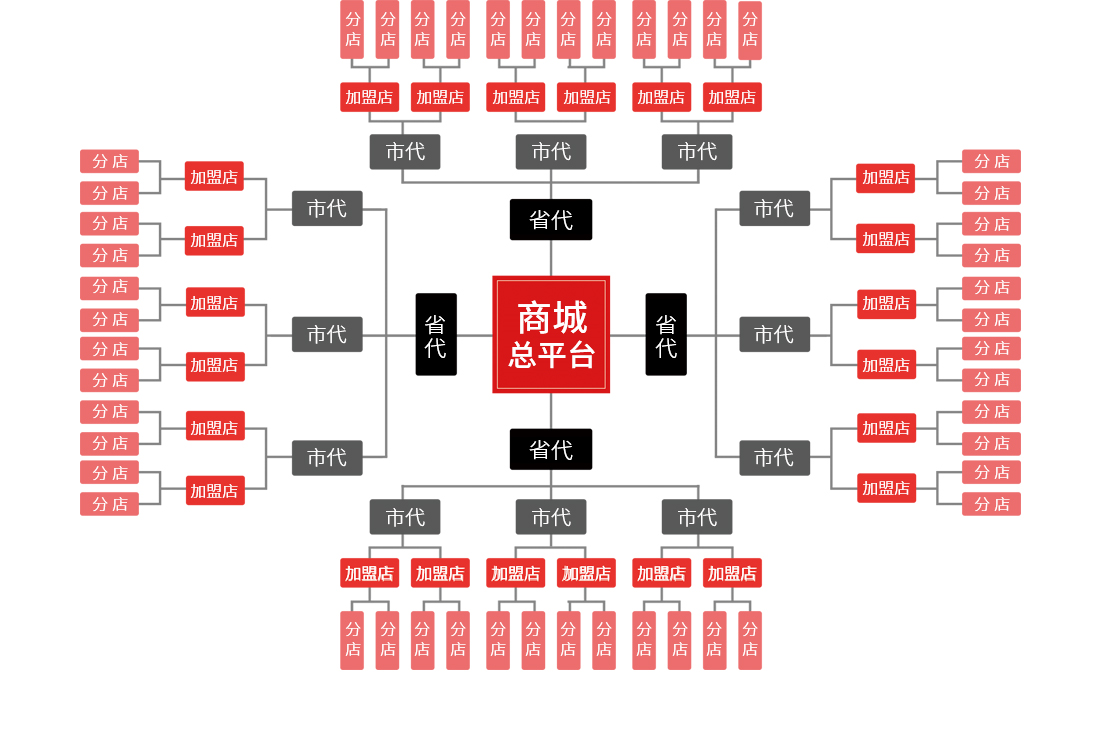 讓代理商、員工及親友、顧客在平臺(tái)上一起開設(shè)該企業(yè)的線上連鎖加盟店。