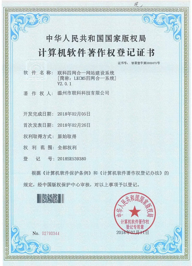 《聯(lián)科四網(wǎng)合一網(wǎng)站建設(shè)系統(tǒng)V2.0.1》于2018年07月11日被正式授予《中華人民共和國國家版權(quán)局計算機軟件著作權(quán)登記證書》,登記號為2018SR539380。