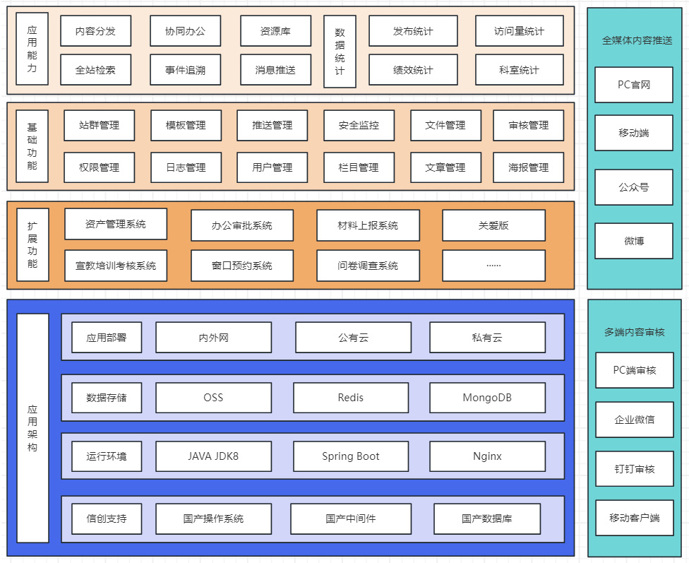 系統(tǒng)支持擴展多渠道信息發(fā)布管理系統(tǒng),實現(xiàn)門戶網(wǎng)站PC端、移動端、微信公眾號、微博等多渠道的內(nèi)容統(tǒng)一發(fā)布和管理。