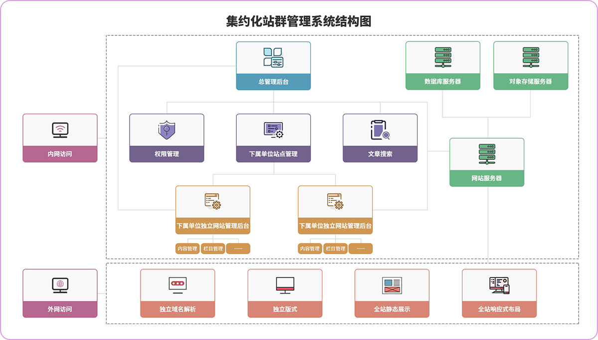 系統(tǒng)既適用于獨立的門戶網(wǎng)站建設(shè),又支持多級別、橫向或縱向的網(wǎng)站群建設(shè),各站點都可以設(shè)置獨立域名進行訪問。系統(tǒng)支持對各個子站進行集約化管理,形成數(shù)據(jù)大集中,有利于資源的整合、共享和管理。系統(tǒng)又可為每個站點指定不同的用戶管理、維護和發(fā)布內(nèi)容,滿足網(wǎng)站群多級管理的需要。